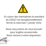 En raison des intempéries le standard du CDG27 est exceptionnellement fermé ce mercredi 7 janvier 2026. Nous vous prions de nous excuser pour la gêne occasionnée Et restons à votre disposition ... Article publié le mercredi 7 janvier 2026